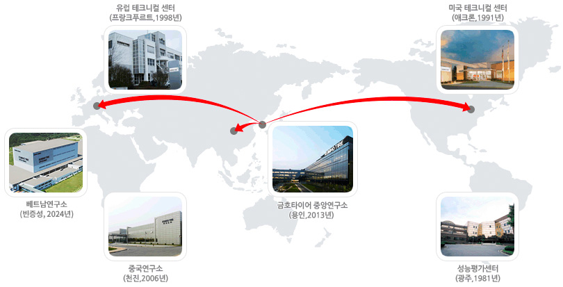 Kumho Tire is a leading company in the global tire industry, boasting innovative technology through its global R&D network. We have established a global R&D network centered around the Central Research and Development Center (KRDC) in Yongin, Gyeonggi Province, and the Kumho Performance Center (KPC) in Gwangju. This network extends to the Kumho America Technical Center (KATC) in Akron, the home of automotive technology in the U.S., the Kumho Europe Technical Center (KETC) in Frankfurt, Germany, the China Technical Center (KCTC), and the newly operational Kumho Vietnam Technical Center (KVTC) in Binh Duong Province, Vietnam.